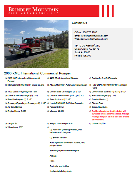 | Gretna Fire & Rescue is selling our 2003 KME International Commercial Pumper! This well-maintained rig has only 42,921 miles and 3,660 engine hours and is loaded with equipment.